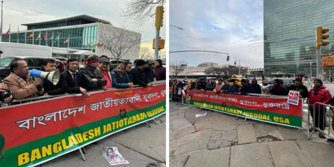 বিএনপি চেয়ারপার্সন বেগম খালেদা জিয়াসহ গ্রেপ্তারকৃত নেতা-কর্মীদের নিঃশর্ত মুক্তি, নির্বাচনী তফসিল বাতিল ও তত্ত্বাবধায়ক সরকারের অধীনে নির্বাচনের দাবিতে নিউইয়র্কে জাতিসংঘ সদর দপ্তরের সামনে বিক্ষোভ করেছে যুক্তরাষ্ট্র যুবদলের নেতা-কর্মীরা।