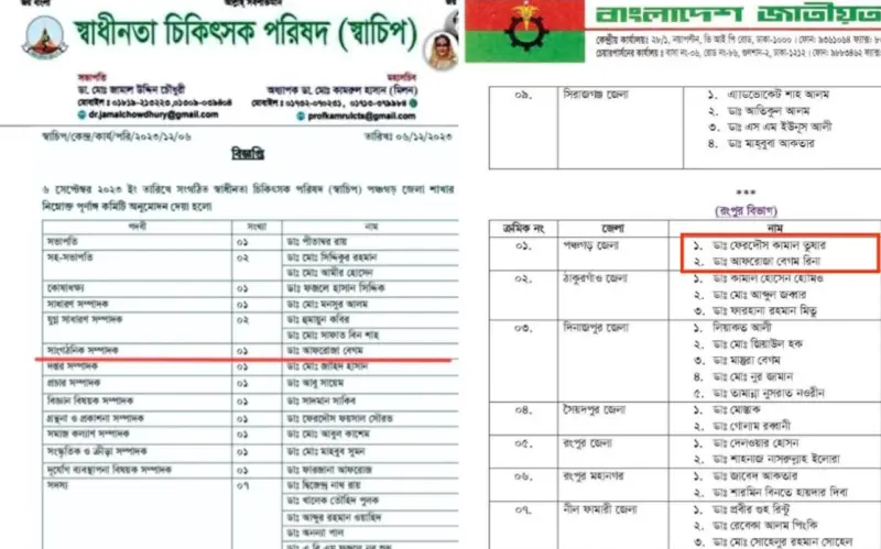 সংশ্লিষ্ট চিকিৎসক ডা. আফরোজা বেগম রীনা এক সময় স্বাধীনতা চিকিৎসক পরিষদের (স্বাচিপ) পঞ্চগড় জেলা কমিটির সাংগঠনিক সম্পাদক ছিলেন। এই তথ্য প্রকাশ্যে আসার পর রাজনৈতিক অঙ্গনে আলোচনা-সমালোচনা শুরু হয়েছে। অনেকেই প্রশ্ন তুলেছেন, স্বাচিপের একজন নেত্রী কীভাবে বিএনপির গুরুত্বপূর্ণ সেলে অন্তর্ভুক্ত হলেন।