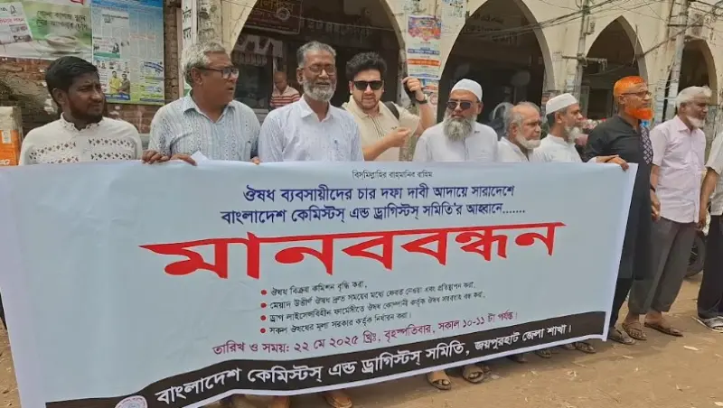 ঔষধ বিক্রয় কমিশন বৃদ্ধি, মেয়াদ উত্তীর্ণ ঔষধ ফেরত ও প্রতিস্থাপনসহ চার দফা দাবিতে জয়পুরহাটে মানববন্ধন করেছে বাংলাদেশ কেমিস্টস এন্ড ড্রাগ্রিস্টস্ সমিতি কেন্দ্রীয় পরিচালনা পরিষদের সদস্যরা।