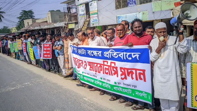 নওগাঁর ধামইরহাটে ইটভাটা বন্ধের প্রতিবাদে ১৬টি ইট ভাটার মালিক-শ্রমিকরা মানববন্ধন কর্মসূচি পালন করেছেন। দ্রুত ভাটা বন্ধের নির্দেশ প্রতাহার করে ইটভাটা পুনরায় চালু করতে উপজেলা নির্বাহী কর্মকর্তা বরাবর স্মারকলিপি প্রদান করা হয়েছে। বুধবার (১২ নভেম্বর) দুপুরে উপজেলা পরিষদের সামনে ইট প্রস্তুতকারক মালিক সমিতির আয়োজনে ঘন্টাব্যাপি মানববন্ধন অনুষ্ঠিত হয়।