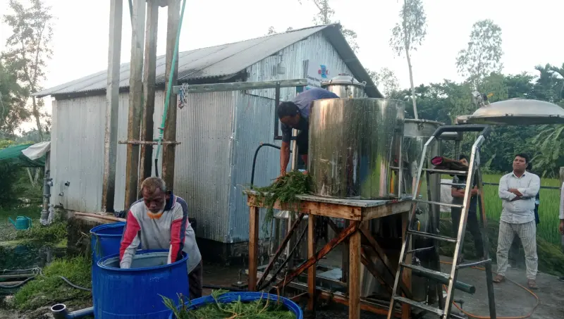 প্রথমে শ্রমিকরা গাছ থেকে পাতা সংগ্রহ করে সেগুলো ড্রামের পানিতে ধুয়ে স্ট্রিলের চৌবাচ্চায় তোলেন। পরে সেই পাতাগুলো চার থেকে পাঁচ ঘণ্টা জাল দিয়ে স্টিম ডিস্টিলেশন পদ্ধতিতে বের করা হয় তেল ও হাইড্রোসল। প্রতি ব্যাচে ৫০ কেজি পাতা থেকে তিন ব্যাচে দিনে দেড় লিটার তেল উৎপাদন হচ্ছে এখন সেখানে। এ কাজে নিয়োজিত শ্রমিকরা জানান, সেখানে তাদের কর্মসংস্থান হওয়ায় তাদের সংসার বেশ ভালো চলছে।
