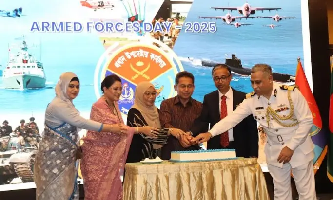 বক্তব্য শেষে হাইকমিশনার, প্রধান অতিথি এবং প্রতিরক্ষা উপদেষ্টা আনুষ্ঠানিকভাবে কেক কেটে দিবসটির তাৎপর্য উদযাপন করেন।