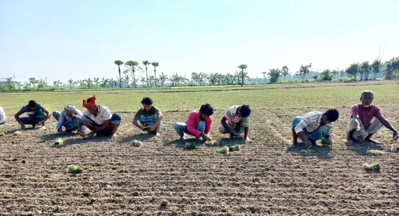 পেঁয়াজের রাজধানী হিসেবে পরিচিত ফরিদপুরের সালথা উপজেলায় ফসলি জমিতে হালি পেঁয়াজের চারা রোপণের ধুম পড়েছে। শীত ও ঘন কুয়াশা উপেক্ষা করে ভোর থেকেই মাঠে নেমে পড়ছেন কৃষক ও কৃষিশ্রমিকরা। দল বেঁধে সারিবদ্ধভাবে চলছে পেঁয়াজ রোপণের কর্মযজ্ঞ -দম ফেলার ফুরসত নেই কারও।