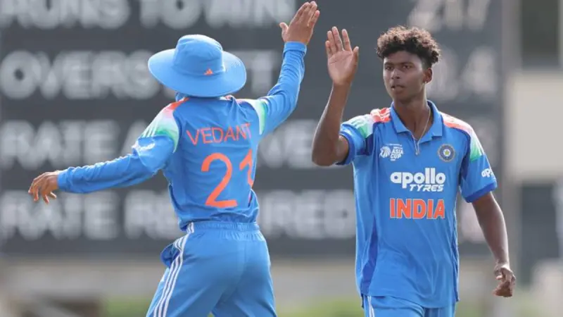 নির্দিষ্ট লক্ষ্য তাড়ায় নেমে শুরুতেই তাসের ঘরের মতো ভেঙে পড়ে পাকিস্তানের টপ অর্ডার। প্রথম চার ব্যাটারের স্কোর ছিল উসমান খান ১৬ রান, সামির মিনহাস ৯ রান, আলি হাসান বালুচ ০ রান, আহমেদ হুসাইন ৪ রান। তিনটি উইকেটই নেন দীপেশ দেবেন্দ্রন এবং একটি নেন কণিষ্ক।