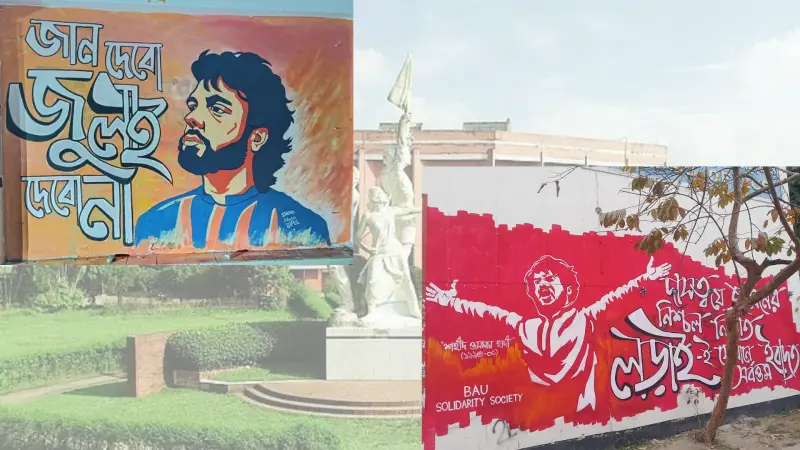 একটি চিত্রকর্ম আঁকা হয়েছে বিশ্ববিদ্যালয়ের ছাত্র–শিক্ষক কেন্দ্র (টিএসসি) ও পূবালী ব্যাংকের সামনের দেয়ালে, অন্যটি পশুপালন অনুষদের দেয়ালে। লাল রঙের পটভূমিতে সাদা ও কালোর মিশেলে আঁকা এসব চিত্রকর্ম যেন নীরব অথচ তীব্র প্রতিবাদের ভাষা হয়ে উঠেছে।