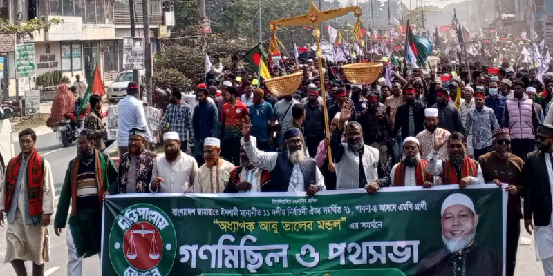 পাবনার ঈশ্বরদীতে বাংলাদেশ জামায়াতে ইসলামী মনোনীত ও ১১ দলীয় ঐক্য সমর্থিত ৭১, পাবনা-৪ আসনের সংসদ সদস্য পদপ্রার্থী অধ্যাপক আবু তালেব মন্ডলের সমর্থনে বিশাল গণমিছিল ও পথসভা অনুষ্ঠিত হয়েছে।
