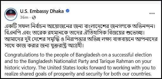 বৃহস্পতিবার (১২ ফেব্রুয়ারি) ত্রয়োদশ জাতীয় সংসদ নির্বাচনের পরদিন শুক্রবার সকালে যুক্তরাষ্ট্র দূতাবাসের এক বিবৃতিতে এ বার্তা দেয়।