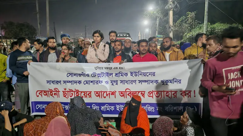 ট্রেড ইউনিয়ন করায় সোনারগাঁও টেক্সটাইলের দুই শ্রমিক নেতাকে ছাঁটাইয়ের প্রতিবাদে বরিশাল-কুয়াকাটা মহাসড়ক অবরোধ করেছেন আন্দোলনরত শ্রমিকরা।