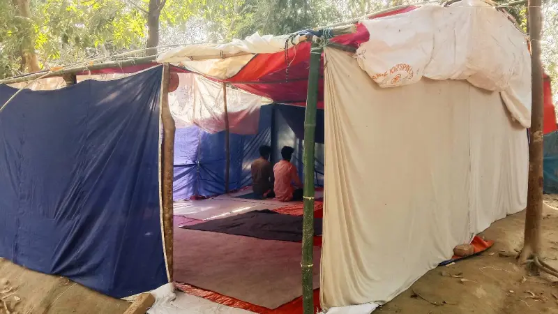 এ অবস্থায় গ্রামের কয়েকজন যুবক ও প্রবীণ ব্যক্তি একত্রিত হয়ে তাবু টানিয়ে অস্থায়ী মসজিদ নির্মাণের সিদ্ধান্ত নেন। বাঁশ, ত্রিপল ও কাপড় দিয়ে তৈরি করা হয়েছে কাঠামো। ভেতরে জায়নামাজ, পাটি ও কার্পেট বিছিয়ে নামাজের ব্যবস্থা করা হয়েছে।