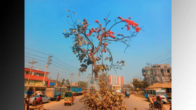 পাতাঝরা ডালে ফুলেল সাজে দাঁড়িয়ে থাকা পলাশ মনে করিয়ে দেয়—ঋতুরাজ বসন্ত এসে গেছে। ব্যস্ত মহাসড়কের একঘেয়ে দৃশ্যের মাঝেও আগুনরাঙা এই ছোঁয়া পথিকের চোখে স্বস্তি আর মনে আনন্দ জাগায়।