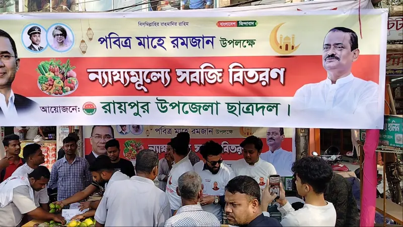 পবিত্র রমজান মাস উপলক্ষে নিত্যপ্রয়োজনীয় পণ্যের মূল্যস্ফীতি নিয়ন্ত্রণ ও সাধারণ মানুষের পাশে দাঁড়াতে লক্ষ্মীপুরের রায়পুরে ন্যায্যমূল্যে সবজি বাজার কর্মসূচি পালন করেছে রায়পুর উপজেলা ছাত্রদল।