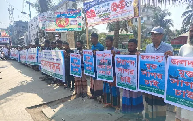 সমুদ্রে মাছ শিকারে গিয়ে প্রতিনিয়ত সশস্ত্র ডাকাত দলের হামলার শিকার হচ্ছেন উপকূলের হাজারো জেলে। গভীর সাগরে জিম্মি করে জেলেদের কাছ থেকে মুক্তিপণ আদায় করছে দুর্বৃত্তরা। এতে ইতোমধ্যে লাখ লাখ টাকা হাতিয়ে নিয়েছে ডাকাত চক্র, আতঙ্কে পড়েছে জেলে পরিবারগুলো এবং চরম অনিশ্চয়তার মুখে পড়েছে উপকূলের মৎস্যজীবী। ডাকাতের হাত থেকে নিজেকে বাঁচতে গিয়ে অনেক হয়েছে গুলিবিদ্ধ। এই উপদ্রবের প্রতিবাদে পাথরঘাটায় মানববন্ধন করেছেন মৎস্যজীবী ও ট্রলারের শ্রমিকেরা।