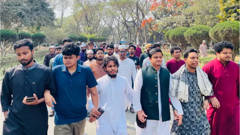 শুক্রবার (২৭ ফেব্রুয়ারি) জুমার নামাজের পর বিশ্ববিদ্যালয়ের কেন্দ্রীয় মসজিদ প্রাঙ্গণ থেকে শিক্ষার্থীরা বিক্ষোভ মিছিল বের করেন। মিছিলটি ক্যাম্পাসের বিভিন্ন সড়ক প্রদক্ষিণ শেষে প্রধান ফটকে গিয়ে সমাবেশে মিলিত হয়।