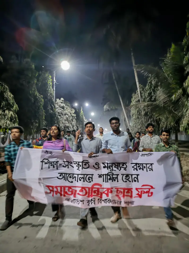 নরসিংদী ও পাবনার ঈশ্বরদীতে পৃথক ঘটনায় দুই কিশোরীকে ধর্ষণের পর হত্যার প্রতিবাদে বিক্ষোভ মিছিল ও সমাবেশ করেছে সমাজতান্ত্রিক ছাত্র ফ্রন্ট, বাংলাদেশ কৃষি বিশ্ববিদ্যালয় (বাকৃবি) শাখা। শনিবার (২৮ ফেব্রুয়ারি) সন্ধ্যায় বিশ্ববিদ্যালয় ক্যাম্পাসে এই কর্মসূচি পালন করা হয়।