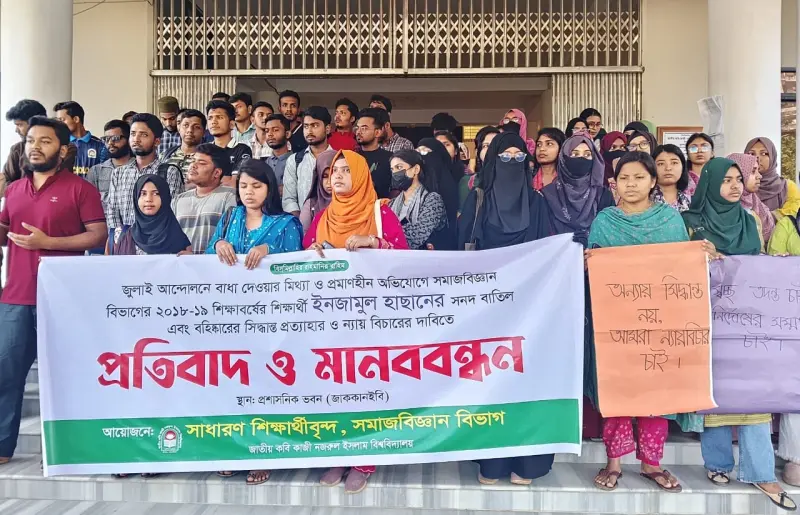 জুলাই অভ্যুত্থানে বাধা দেওয়ার অভিযোগে ময়মনসিংহের ত্রিশালে অবস্থিত জাতীয় কবি কাজী নজরুল ইসলাম বিশ্ববিদ্যালয়ে শাস্তিপ্রাপ্ত সমাজবিজ্ঞান বিভাগের ২০১৮–১৯ শিক্ষাবর্ষের শিক্ষার্থী ইনজামামুল হাসানের বহিষ্কারাদেশ ও সনদ বাতিলের সিদ্ধান্ত পুনর্বিবেচনার দাবিতে মানববন্ধন অনুষ্ঠিত হয়েছে।বৃহস্পতিবার (৪ ডিসেম্বর) বেলা ১১টার দিকে সমাজবিজ্ঞান বিভাগের শিক্ষার্থীরা প্রশাসনিক ভবনের সামনে এ মানববন্ধন কর্মসূচি আয়োজন করে। মানববন্ধনে অংশ নিয়ে শিক্ষার্থীরা বলেন, “একজন শিক্ষার্থীর সনদ বাতিল করে দেওয়া মানে তার ভবিষ্যৎ পুরোপুরি ধ্বংস করে দেওয়া। তদন্ত প্রক্রিয়ায় স্বচ্ছতা নিয়ে প্রশ্ন রয়েছে।”তারা আরও বলেন, “ইনজামুল কখনোই সহিংসতায় জড়িত ছিল না। তদন্ত কমিটির প্রতিবেদনে তার বক্তব্য যথাযথভাবে বিবেচনা করা হয়নি।” বক্তারা দ্রুত সিদ্ধান্ত স্থগিত ও নিরপেক্ষ তদন্তের দাবি জানান। তারা বলেন, ‘বিশ্ববিদ্যালয়ের শৃঙ্খলা রক্ষার নামে কাউকে অন্যায়ভাবে বঞ্চিত করা যাবে না।’এর আগে মানববন্ধনকারীরা বিশ্ববিদ্যালয়ের উপাচার্য বরাবর একটি স্মারকলিপি জমা দেন। একই দাবিতে ৩ ডিসেম্বর বিশ্ববিদ্যালয়ের কুমিল্লা এসোসিয়েশনের শিক্ষার্থীরাও পৃথক একটি স্মারকলিপি জমা দেন।উল্লেখ্য, গত ২৭ নভেম্বর অনুষ্ঠিত বিশ্ববিদ্যালয়ের ৯০তম সিন্ডিকেট সভায় বৈষম্যবিরোধী ছাত্র আন্দোলনে বাধা, হুমকি, হামলায় আহতদের চিকিৎসায় বাধা এবং উসকানিমূলক কর্মকাণ্ডের অভিযোগে তদন্ত কমিটির প্রতিবেদন পর্যালোচনা করে ইনজামামুল হাসানসহ ১৩ জন শিক্ষার্থীকে শাস্তি দেওয়া হয়। তাদের মধ্যে যারা এখনও ছাত্রত্বে রয়েছে তাদের স্থায়ী বহিষ্কার এবং যারা কোর্স সম্পন্ন করেছে তাদের স্নাতক ও স্নাতকোত্তর উভয় সনদ বাতিলের সিদ্ধান্ত গৃহীত হয়।ইখা