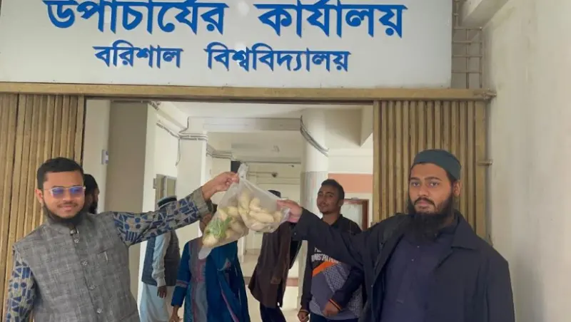 বরিশাল বিশ্ববিদ্যালয়ের উপাচার্যের দপ্তরে প্রতীকী প্রতিবাদ হিসেবে ‘মূলা’ উপহার দিয়েছে ইসলামী শাসনতন্ত্র ছাত্র আন্দোলন (ইশাস) ববি শাখা। বৃহস্পতিবার দুপুর একটার দিকে সংগঠনের কয়েকজন কর্মী হাতে মূলা নিয়ে ভিসি অফিসে উপস্থিত হন। তাদের ভাষ্য, ‘বিশ্ববিদ্যালয় প্রশাসনের একের পর এক প্রতিশ্রুতি বাস্তবায়নে ব্যর্থতার প্রতীক হিসেবেই এই প্রতিবাদ।’ইশাস ববি শাখার সভাপতি হাসিবুর রহমান বলেন, ‘বিশ্ববিদ্যালয় প্রশাসন ৭-৮ মাস পার হলেও এখনো খেলাধুলার জন্য মাঠ প্রস্তুত করতে পারেনি। হিট প্রজেক্টের চূড়ান্ত বোঝাপড়া সম্পন্ন হয়নি বিভাগগুলোর সঙ্গে। কর্মচারীদের বেতন আটকে আছে, ছাত্রসংসদ নির্বাচনেও গড়িমসি চলছে। প্রশাসন শুধু প্রতিশ্রুতি দিয়ে যাচ্ছে, বাস্তবায়ন করছে না। বিভিন্ন সময়ে আমাদের সামনে মূলা ঝুলিয়েছে, তাই আজ আমরা প্রতীকীভাবে মূলাই তাদের অফিসে পৌঁছে দিয়েছি।’প্রচার সম্পাদক মেহেদি হাসান বলেন, ‘দীর্ঘদিন ধরে বিশ্ববিদ্যালয়ে নানামুখী সংকট বিদ্যমান থাকলেও তার কোনো কার্যকর সমাধান পাওয়া যাচ্ছে না। প্রশাসনের আশ্বাস এখন শিক্ষার্থীদের কাছে মূলায় পরিণত হয়েছে। এই মূলা নিতে নিতে আমরা ক্লান্ত।’উল্লেখ্য, বরিশাল বিশ্ববিদ্যালয় দীর্ঘদিন ধরে আবাসিক হল সংকট, ক্লাসরুম স্বল্পতা, কেন্দ্রীয় খেলার মাঠের সংস্কার বিলম্ব, কর্মচারীদের বেতন-ভাতা স্থগিত থাকা এবং শিক্ষকদের পদোন্নতি সংক্রান্ত জটিলতা—এমন নানা সমস্যায় ভুগছে।এসএম