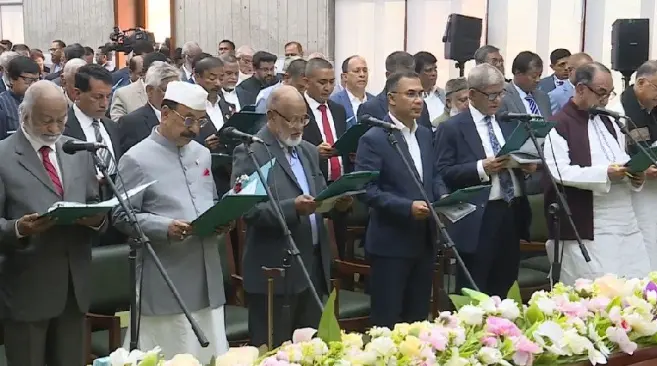তারেক রহমানের নেতৃত্বে শপথ গ্রহণ করেছেন নতুন মন্ত্রিসভার সদস্যরা। মঙ্গলবার (১৭ ফেব্রুয়ারি) বিকেল ৪টার পর জাতীয় সংসদ ভবন প্রাঙ্গণে রাষ্ট্রপতি, প্রধান উপদেষ্টা এবং নতুন মন্ত্রিসভার সদস্যদের উপস্থিতে এই শপথ গ্রহণ অনুষ্ঠান অনুষ্ঠিত হয়।অনুষ্ঠানের শুরুর দিকে ত্রয়োদশ জাতীয় সংসদ নির্বাচনে জয়ী বিএনপির চেয়ারম্যান তারেক রহমান ১১তম প্রধানমন্ত্রী হিসেবে শপথ গ্রহণ করেন। মঙ্গলবার জাতীয় সংসদ ভবনের দক্ষিণ প্লাজায় রাষ্ট্রপতি মো. সাহাবুদ্দিন তাকে শপথ পড়ান। এরপর মন্ত্রীদের শপথ পড়ানো হয়, তারপর শপথ পাঠ করেন প্রতিমন্ত্রীরা।জানা যায়, বিএনপির মহাসচিব মির্জা ফখরুল ইসলাম আলমগীর স্থানীয় সরকার পল্লী উন্নয়ন ও সমবায় মন্ত্রণালয়ের দায়িত্ব পেয়েছেন।এছাড়া সালাউদ্দিন আহমদ- স্বরাষ্ট্র মন্ত্রণালয়, আমীর খসরু মাহমুদ চৌধুরী- অর্থ ও পরিকল্পনা মন্ত্রণালয়, মেজর (অব.) হাফিজ উদ্দিন আহমেদ- মুক্তিযুদ্ধ বিষয়ক মন্ত্রণালয়, ইকবাল হাসান মাহমুদ টুকু- বিদ্যুৎ, জ্বালানি ও খনিজসম্পদ মন্ত্রণালয়, ডা. এ জেড এম জাহিদ হোসেন- মহিলা ও শিশু, সমাজকল্যাণ মন্ত্রণালয়, ড. খলিলুর রহমান (টেকনোক্র্যাট)- পররাষ্ট্র মন্ত্রণালয়, আব্দুল আওয়াল মিন্টু- পরিবেশ, বন ও জলবায়ু পরিবর্তন মন্ত্রণালয়, মিজানুর রহমান মিনু- ভূমি মন্ত্রণালয়, নিতাই রায় চৌধুরী- সংস্কৃতি বিষয়ক মন্ত্রণালয়, মোহাম্মদ আসাদুজ্জামান- আইন, বিচার ও সংসদ বিষয়ক মন্ত্রণালয়ের দায়িত্ব পেয়েছেন।এছাড়া কাজী শাহ মোফাজ্জল হোসেন কায়কোবাদ- ধর্ম বিষয়ক মন্ত্রণালয়, আরিফুল হক চৌধুরি- শ্রম ও কর্মসংস্থান, প্রবাসী কল্যাণ ও বৈদেশিক কর্মসংস্থান মন্ত্রণালয়, খন্দকার আবদুল মুক্তাদির- বাণিজ্য, শিল্প, বস্ত্র ও পাট মন্ত্রণালয়, জহির উদ্দিন স্বপন- তথ্য ও সম্প্রচার মন্ত্রণালয়, শহীদ উদ্দিন চৌধুরী এ্যানি- পানি সম্পদ মন্ত্রণালয়, এহসানুল হক মিলন- শিক্ষা, প্রাথমিক ও গণশিক্ষা মন্ত্রণালয়, আমিন উর রশিদ (টেকনোক্র্যাট), কৃষি মন্ত্রণালয়, মৎস্য ও প্রাণিসম্পদ, খাদ্য মন্ত্রণালয়, আফরোজা খানম- বেসামরিক বিমান ও পর্যটন মন্ত্রণালয়, আসাদুল হাবীব দুলু- দুর্যোগ ব্যবস্থাপনা ও ত্রাণ মন্ত্রণালয়, জাকারিয়া তাহের- গৃহায়ন ও গণপূর্ত মন্ত্রণালয়, দীপেন দেওয়ান- পার্বত্য চট্টগ্রাম বিষয়ক মন্ত্রণালয়, সরদার মো. সাখাওয়াত হোসেন বকুল- স্বাস্থ্য ও পরিবার পরিকল্পনা মন্ত্রণালয়, ফকির মাহবুব আনাম- ডাক ও টেলিযোগাযোগ, বিজ্ঞান ও প্রযুক্তি মন্ত্রণালয় এবং শেখ রবিউল আলম, সড়ক পরিবহন ও সেতু, রেলপথ ও নৌ-পরিবহন মন্ত্রণালয়ের দায়িত্ব পেয়েছেন।প্রতিমন্ত্রীদের মধ্যে এম রশিদুজ্জামান মিল্লাত- বেসামরিক বিমান পরিবহন ও পর্যটন মন্ত্রণালয়, অনিন্দ্য ইসলাম অমিত- বিদ