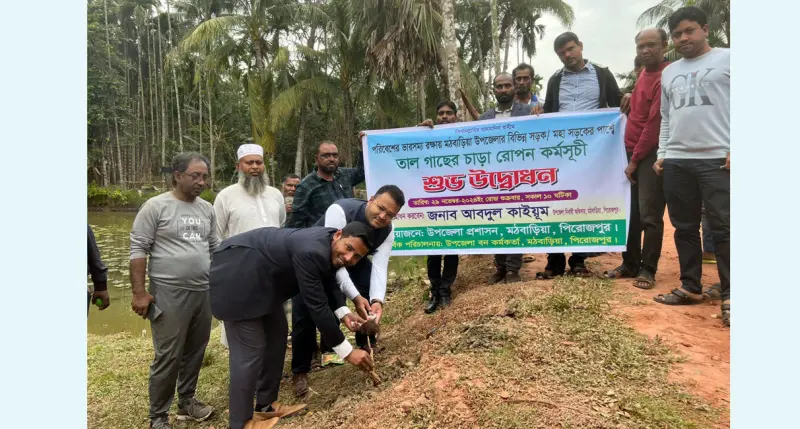 পিরোজপুরের মঠবাড়িয়ায় প্রাকৃতিক দুর্যোগ মোকাবেলা ও বজ্রপাত থেকে রক্ষা পেতে রাস্তার ২ ধারে প্রায় ৬ কিলোমিটার জুড়ে তালের বীজ বপনের উদ্বোধন করেন উপজেলা নির্বাহী অফিসার আবদুল কাইয়ূম। নিজ উদ্যেগে উপজেলা বন কর্মকর্তার মাধ্যমে বিভিন্ন বাড়ি থেকে তালের বীজ সংগ্রহ করে শুক্রবার (২৯ নভেম্বর) দুপুরে স্থানীয় হারজি গ্রামের মিরুখালী রাস্তায় তালবীজ বপন করেন।