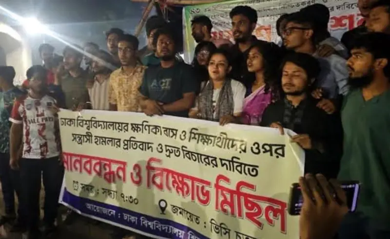 ঢাকা বিশ্ববিদ্যালয়ের (ঢাবি) টঙ্গী-গাজীপুর রুটের পরিবহণ ক্ষণিকা বাসে হামলার প্রতিবাদে বিক্ষোভ মিছিল করেছে বিশ্ববিদ্যালয়ের একদল শিক্ষার্থী।