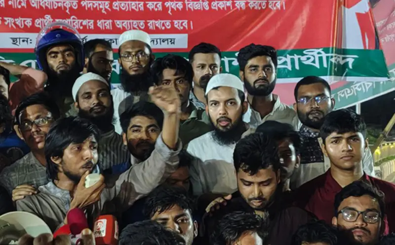 শিক্ষার্থীরা বলেন, ভারতের প্রেসক্রিপশনে আগে জিএম কাদেররা নির্বাচন করেছে। আওয়ামী লীগ বিপদে থাকায় ভারত জাতীয় পার্টিকে এখন বি টিম হিসেবে ব্যবহার করে নির্বাচনে অংশ নেয়ার সুযোগ করে দিচ্ছে৷ জাতীয় পার্টির উপর ভর করে আওয়ামী লীগের পুনর্বাসনের চেষ্টা করা হচ্ছে। কিন্তু আমরা স্পষ্ট বলতে চাই এমনটা হলে আবারও আপনাদের উপর ৫ আগস্ট নেমে আসবে।