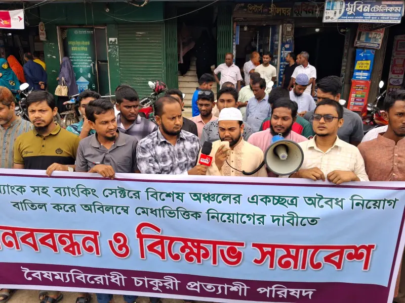 ইসলামী ব্যাংকসহ দেশের ব্যাংকিং খাতে এস আলম গ্রুপের ‘অবৈধ নিয়োগ ও একচ্ছত্র দখলদারীত্ব’ বাতিলের দাবিতে মানববন্ধন করেছে বিরামপুর বৈষম্যবিরোধী চাকুরী প্রত্যাশী পরিষদ ও ইসলামী ব্যাংক গ্রাহক ফোরাম।