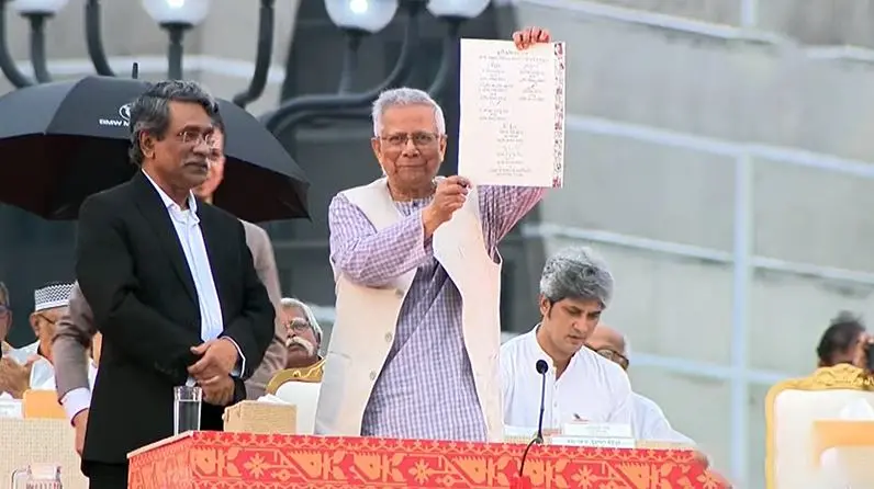বক্তব্য প্রদানকালে ড. মোহাম্মদ ইউনূস জোর দিয়ে বলেন, জাতি আজ এক নবজন্মের সন্ধিক্ষণে। এই ঐতিহাসিক পরিবর্তন সম্ভব হয়েছে গণঅভ্যুত্থানের কারণে, বিশেষ করে ছাত্র জনতার অভ্যুত্থানের কারণে। তিনি স্বাক্ষর অনুষ্ঠানটিকে সেই অভ্যুত্থানের “দ্বিতীয় অংশ” হিসেবে আখ্যায়িত করেন।