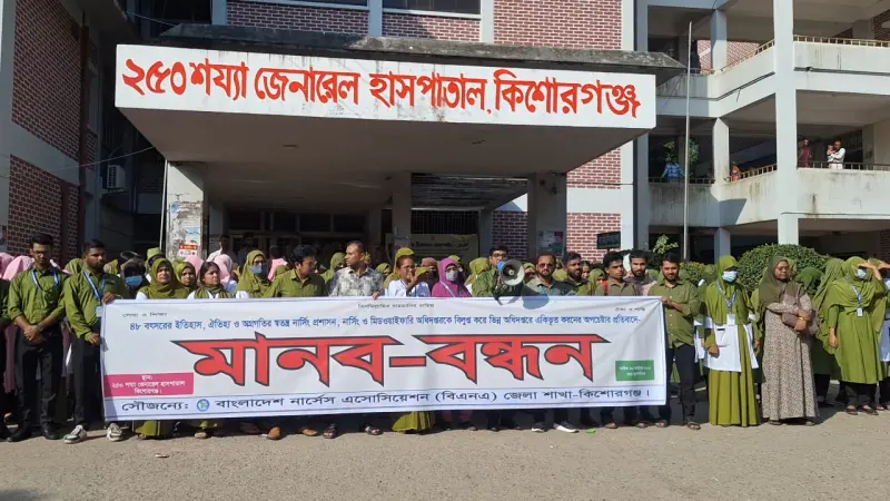 বৃহস্পতিবার (৩০ অক্টোবর) দুপুরে কিশোরগঞ্জ জেলা শাখার উদ্যোগে কিশোরগঞ্জ ২৫০ শয্যা জেনারেল হাসপাতালের সামনে এ মানববন্ধন অনুষ্ঠিত হয়। এতে জেলার বিভিন্ন হাসপাতাল ও স্বাস্থ্যকেন্দ্রের নার্স, মিডওয়াইফ ও স্বাস্থ্যকর্মীরা অংশ নেন।