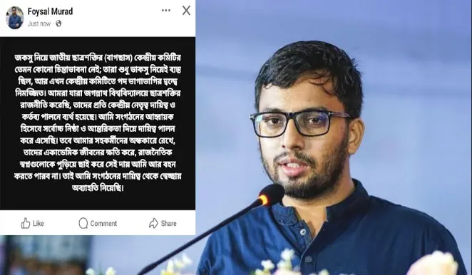 জাতীয় ছাত্রশক্তি জগন্নাথ বিশ্ববিদ্যালয় (জবি) শাখার আহ্বায়ক ফয়সাল মুরাদ সংগঠনটির দায়িত্ব থেকে পদত্যাগ করেছেন।