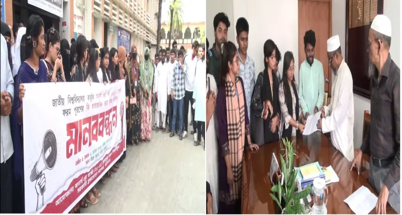 জাতীয় বিশ্ববিদ্যালয় কতৃক অনার্স তৃতীয় বর্ষ ২০২১-২২ সেশনের ফরম পূরনের ফি অস্বাভাবিকভাবে বৃদ্ধির প্রতিবাদে মানববন্ধন করেছেন বিএম কলেজের শিক্ষার্থীরা।