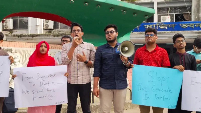 সুদানের পশ্চিম দারফুর অঞ্চলের আল-ফাশের শহরে চলমান গণহত্যা বন্ধ ও আন্তর্জাতিক সম্প্রদায়কে শান্তি প্রতিষ্ঠার দাবিতে মানববন্ধন করেছে জগন্নাথ বিশ্ববিদ্যালয় (জবি) হিউম্যান রাইটস সোসাইটি।