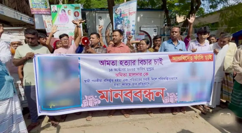 মানববন্ধনে নিহত অমৃতা হালদারের বাবা আনন্দ হালদার অভিযোগ করে বলেন, অমৃতাকে নির্মমভাবে হত্যা করে এ ঘটনা আত্মহত্যা বলে চালিয়ে দেওয়া হয়েছে। তার স্বামী জীবন বর্মণসহ পরিবারের সদস্যরা দীর্ঘদিন ধরে অমিতার ওপর শারীরিক ও মানসিক নির্যাতন চালাতেন। একপর্যায়ে তাঁরা অমৃতাকে হত্যা করেন বলে দাবি তার বাবার।