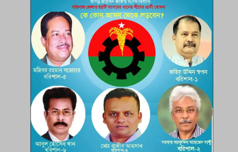 বরিশাল-১ (গৌরনদী-আগৈলঝাড়া) জহির উদ্দিন স্বপন, বরিশাল-২ (উজিরপুর-বানারীপাড়া) এস সরফুদ্দিন সান্টু, বরিশাল-৪ (হিজলা-মেহেন্দীগঞ্জ) রাজীব আহসান, বরিশাল-৫ (বরিশাল সদর) মজিবর রহমান সরোয়ার এবং বরিশাল-৬ (বাকেরগঞ্জ) আসনে আবুল হোসেন খান ধানের শীষ পেয়েছেন।