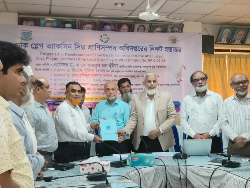 বাংলাদেশ কৃষি বিশ্ববিদ্যালয়ের (বাকৃবি) ভেটেরিনারি অনুষদের উদ্ভাবিত ডাক প্লেগ ভ্যাকসিনের সিড প্রাণিসম্পদ অধিদপ্তরের নিকট হস্তান্তর করা হয়েছে।