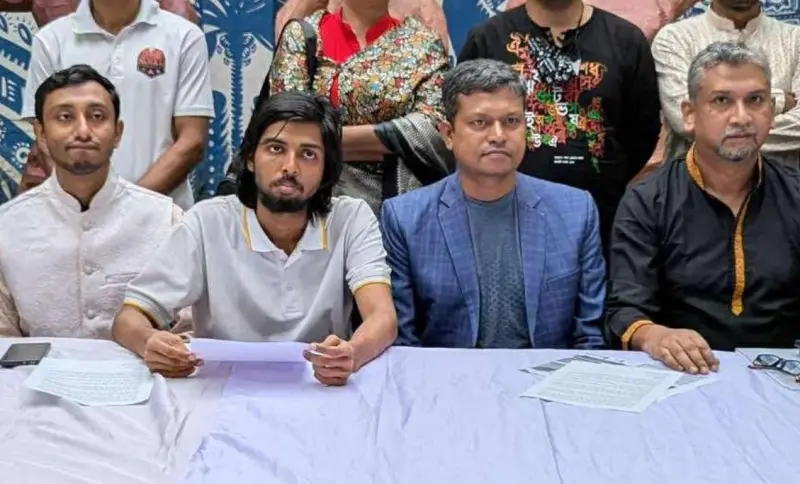 চারুকলা অনুষদে আয়োজিত সংবাদ সম্মেলনে ডাকসুর সাহিত্য ও সংস্কৃতি সম্পাদকের সঙ্গে সমাজসেবা সম্পাদক এবি যুবায়ের, স্বাস্থ্য বিষয়ক সম্পাদক আব্দুল্লাহ আল মিনহাজ ও বিপ্লবী সাংস্কৃতিক ঐক্যের সভাপতি মৃন্ময় মিজান উপস্থিত ছিলেন।