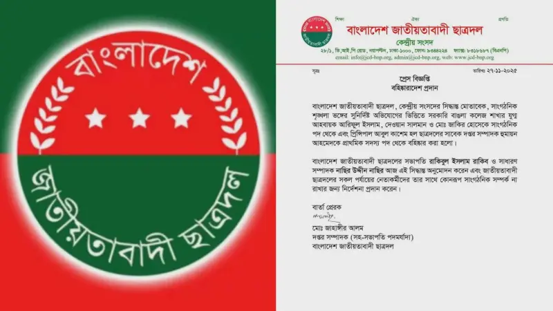 বৃহস্পতিবার (২৭ নভেম্বর) রাতে বাংলাদেশ জাতীয়তাবাদী ছাত্রদল কেন্দ্রীয় সংসদের এক বিবৃতিতে তাদের বহিষ্কারাদেশ প্রদান করা হয়।