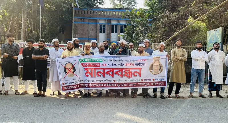 ফরিদপুরের সদরপুরে আল্লাহর প্রতি কটূক্তি ও পবিত্র আল-কোরআনের আয়াত বিকৃতির অভিযোগে শিল্পী আবুল সরকারের ফাঁসি দাবি করে মানববন্ধন অনুষ্ঠিত হয়েছে। শুক্রবার (২৮ নভেম্বর) জুমার নামাজ শেষে সদরপুর থানার সামনে মেইন সড়কে সর্বস্তরের মুসলিম জনতা কর্মসূচি পালন করেন।