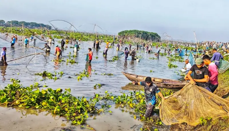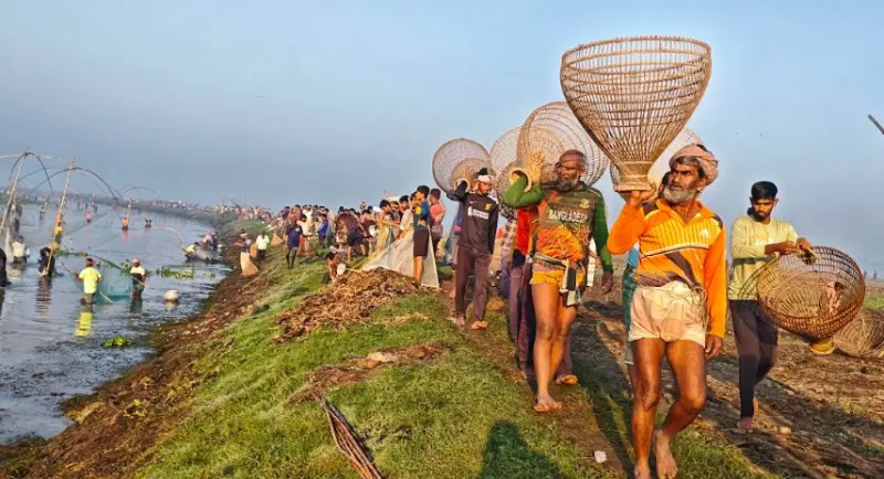 কারও হাতে পলো, কারও হাতে খেয়া জাল, বাদাই জালসহ মাছ ধরার নানা উপকরণ। এরপর দল বেঁধে বিলে নেমে মনের আনন্দে মাছ শিকার করছেন। কেউ পাচ্ছেন রুই, কাতল, কেউবা বোয়াল, শোল। আবার অনেকে ফিরছেন খালি হাতে।