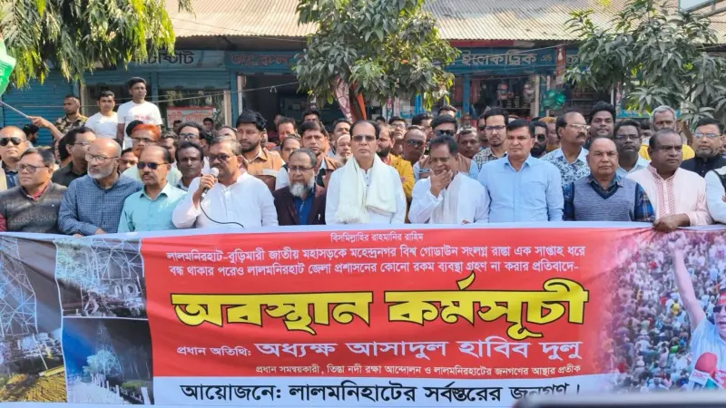 লালমনিরহাট-বুড়িমারী জাতীয় মহাসড়কের মহেন্দ্রনগর এলাকার বিশ্ব সারগোডাউন সংলগ্ন রাস্তাটি সড়ক দুর্ঘটনার কারণে গত একসপ্তাহ ধরে বন্ধ থাকার পরেও লালমনিরহাট জেলা প্রশাসন কোনরকম ব্যবস্থা গ্রহণ না করার প্রতিবাদে অবস্থান কর্মসূচি পালন করেন জেলার লালমনিরহাটের সর্বস্তরের জনগণ।