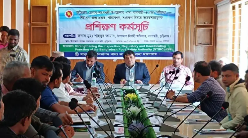 কুড়িগ্রামে নিরাপদ খাদ্য বিষয়ক প্রশিক্ষণ কর্মসূচি অনুষ্ঠিত হয়েছে। আজ ২৯ নভেম্বর ২০২৫ খ্রিস্টাব্দ তারিখে Strengthening the Inspection, Regulatory and Coordinating Function of the Bangladesh Food Safety Authority (STIRC) প্রকল্পের আওতায় উপজেলা প্রশাসন, নাগেশ্বরী, কুড়িগ্রাম এবং বাংলাদেশ নিরাপদ খাদ্য কর্তৃপক্ষ, কুড়িগ্রাম জেলা কার্যালয়ের যৌথ আয়োজনে খাদ্য ব্যবসার সঙ্গে সংশ্লিষ্টদের অংশগ্রহণে নিরাপদ খাদ্য বিষয়ক প্রশিক্ষণ কর্মসূচি অনুষ্ঠিত হয়।