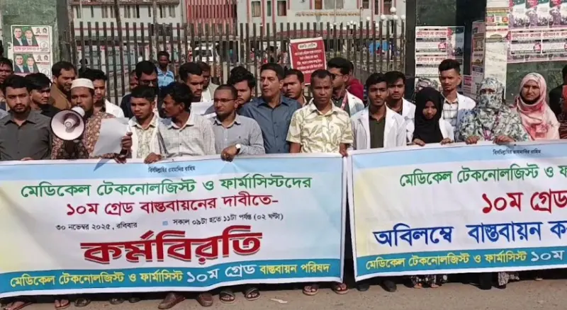 এখানে বক্তারা মেডিকেল টেকনোলজিস্ট ও ফার্মাসিস্টদের ১০ম গ্রেড অতিদ্রুত বাস্তবায়নের দাবি জানান।