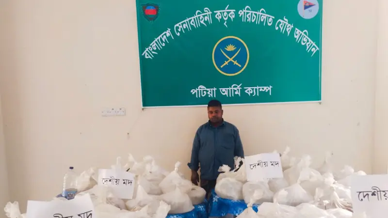 চট্টগ্রামের পটিয়ায় চোলাই মদসহ এক ব্যক্তিকে আটক করেছে যৌথবাহিনী। এসময় ৫৮১ লিটার মদ উদ্ধার করা হয়। যার বাজার মূল্য প্রায় ৫ লাখ টাকা। পরে আটক রাসেল মহাজনকে (৪১) পটিয়া থানায় হস্তান্তর করা হয়েছে।