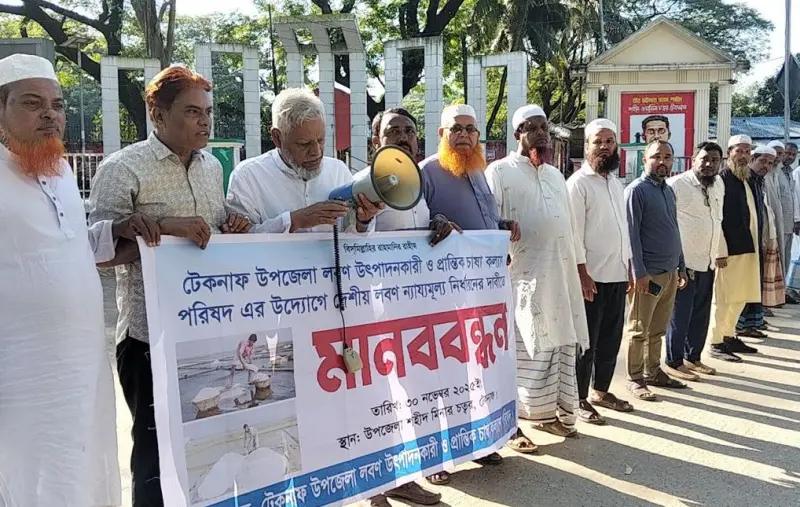 তারেই ধারাবাহিকতায় রবিবার (৩০ নভেম্বর) বিকেল ৩ টার দিকে টেকনাফ উপজেলা শহীদ মিনার সংলগ্ন এলাকায় উক্ত এলাকার প্রান্তিক চাষী ও ব্যবসায়ীরা লবণের ন্যায্য মূল্য নিশ্চিত করার লক্ষ্যে, একটি মানববন্ধনে মিলিত হন।