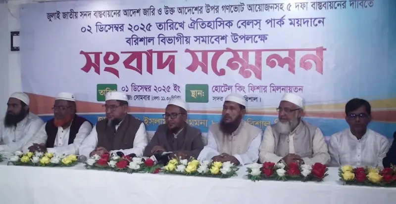 সোমবার (১ ডিসেম্বর) সকাল সাড়ে ১১ টায় বরিশাল নগরের একটি রেস্তরায় সংবাদ সম্মেলন করে এ তথ্য জানানো হয়। সংবাদ সম্মেলনে ইসলামী আন্দোলন বাংলাদেশের বরিশাল জেলা কমিটির সভাপতি মাওলানা মোঃ সিরাজুল ইসলাম বলেন, ‘৫ দফা দাবির পক্ষে দেশের ৭ বিভাগীয় নগরে সমাবেশের আয়োজন করা হয়েছে। এরই অংশ হিসেবে মঙ্গলবার বরিশালে বিভাগীয় সমাবেশ অনুষ্ঠিত হবে। মঙ্গলবারের সমাবেশে কমপক্ষে ১০ লক্ষাধিক মানুষের সমাগম ঘটবে।’ ঘোষিত জুলাই সনদের আইনী ভিত্তি , জুলাই সনদ বাস্তবায়ন, জাতীয় নির্বাচনের আগে গনভোটের দাবী, উচ্চ ও নিন্ম কক্ষে পি.আর পদ্বতীতে নির্বাচন ও নির্বাচনে লেভেল প্লেয়িং ফিল্ড তৈরী করার দাবীতে মঙ্গলবারের এ বিভাগীয় সমাবেশ বলে জানান এ নেতা।