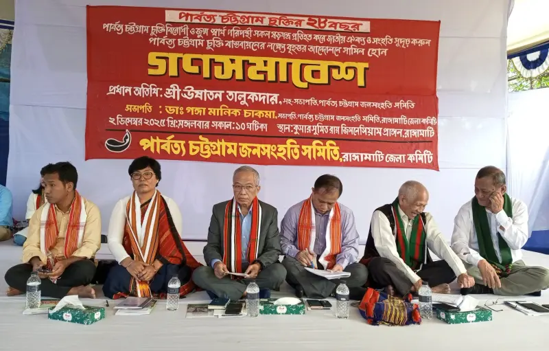 আয়োজিত গণ সমাবেশে বক্তারা বলেন, ‘দীর্ঘ ২৮ বছর পরেও চুক্তির গুরুত্বপূর্ণ ধারাগুলো বাস্তবায়ন না হওয়া খুবই দুর্ভাগ্যজনক এবং হতাশাব্যঞ্জক, পার্বত্য চট্টগ্রাম চুক্তি দেশের জন্য একটি গুরুত্বপূর্ণ রাজনৈতিক মাইলফলক হলেও দীর্ঘ ২৮ বছরেও এর পূর্ণ বাস্তবায়ন হয়নি। নানা প্রতিবন্ধকতা ও ষড়যন্ত্র চুক্তির অগ্রগতিকে বাধাগ্রস্ত করছে বলে অভিযোগ করেন তারা। বক্তাদের দাবি, জাতীয় ঐক্যের ভিত্তিতে বৃহত্তর গণআন্দোলন গড়ে তুলেই চুক্তির পূর্ণ বাস্তবায়ন নিশ্চিত করা সম্ভব।
