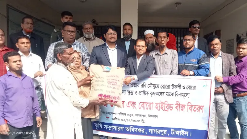 টাঙ্গাইলের নাগরপুরে ২০২৫-২৬ অর্থবছরের প্রণোদনা কর্মসূচির আওতায় ক্ষুদ্র ও প্রান্তিক কৃষকদের মধ্যে বিনামূল্যে বোরো উফশী ও বোরো হাইব্রিড ধানের বীজ ও সার বিতরণ করা হয়েছে। মঙ্গলবার (০২ ডিসেম্বর) সকালে উপজেলা পরিষদ চত্বরে উপজেলা কৃষি সম্প্রসারণ অধিদপ্তরের উদ্যোগে এ কর্মসূচি সম্পন্ন হয়।