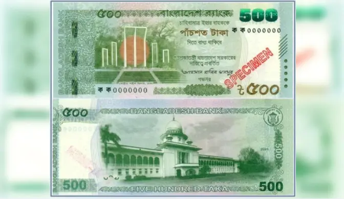 নতুন ৫০০ টাকার নোটের সামনে রয়েছে, কেন্দ্রীয় শহীদ মিনারের ছবি এবং মাঝখানে পাতা ও কলিসহ জাতীয় ফুল শাপলা। আর নোটের পেছনে রাখা হয়েছে বাংলাদেশ সুপ্রিম কোর্টের ছবি। নোটে জলছাপ হিসেবে ব্যবহার করা হয়েছে রয়েল বেঙ্গল টাইগারের মুখ, যার নিচে ইলেকট্রো টাইপে ‘৫০০’ এবং বাংলাদেশ ব্যাংকের মনোগ্রাম দেখা যাবে। পুরো নোটে সবুজ রঙের আধিক্য রাখা হয়েছে।
