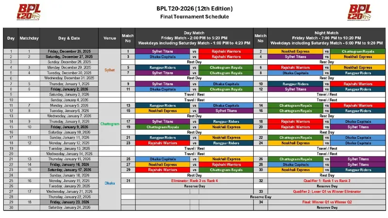 বিসিবির প্রকাশিত সূচি অনুযায়ী, এবার ঢাকার মিরপুর শের-ই-বাংলা জাতীয় ক্রিকেট স্টেডিয়ামে খেলা হবে মাত্র ১০টি। অন্যদিকে, সিলেট আন্তর্জাতিক ক্রিকেট স্টেডিয়াম এবং চট্টগ্রামের বীরশ্রেষ্ঠ শহীদ ফ্লা. লে. মতিউর রহমান স্টেডিয়াম—উভয় ভেন্যুই পাচ্ছে ১২টি করে ম্যাচ। তবে টুর্নামেন্টের সবচেয়ে গুরুত্বপূর্ণ চারটি প্লে-অফ ম্যাচসহ ফাইনাল আয়োজনের দায়িত্ব থাকছে মিরপুরের কাঁধেই।