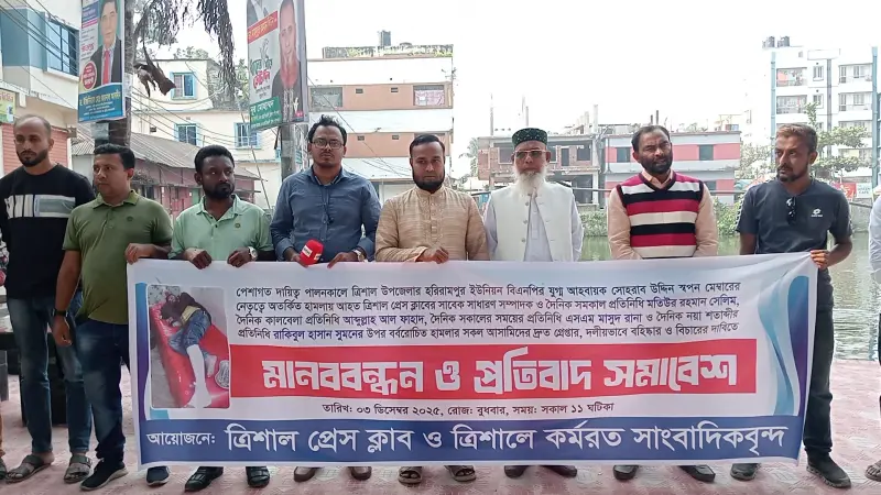 এ সময় বক্তব্য দেন, ত্রিশাল প্রেসক্লাবের সাবেক সভাপতি মোখলেছুর রহমান সবুজ, ত্রিশাল প্রেসক্লাবের সভাপতি খোরশিদুল আলম মজিব, ত্রিশাল প্রেসক্লাবের সাধারণ সম্পাদক এইচ এম জোবায়ের হোসাইন প্রমূখ। সাংবাদিকরা বলেন, ‘সাংবাদিকের ওপর এমন ন্যাক্কারজনক হামলা কোনোভাবেই মেনে নেওয়া যায় না। হামলাকারী সন্ত্রাসীদের দ্রুত আইনের আওতায় এনে দৃষ্টান্তমূলক শাস্তি নিশ্চিত করতে হবে।’