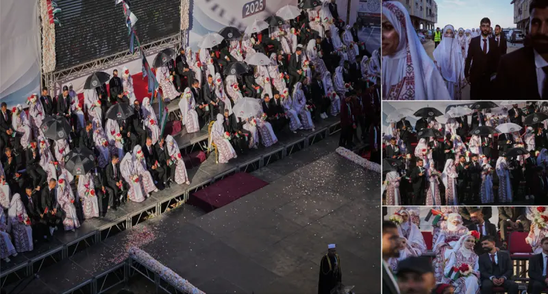 দক্ষিণ গাজার ধ্বংসপ্রাপ্ত অনেকগুলো ভবন নৃশংসতার প্রতীক হয়ে দাঁড়িয়ে আছে। এর সামনে হাজার হাজার মানুষের ভিড়। যেখানে আয়োজেন করা হয়েছে এক গণবিয়ে অনুষ্ঠানের। যা দীর্ঘ দুই বছরের টানা সংঘাত, মৃত্যু ও ধ্বংসযজ্ঞের মাঝে আশার আলো দেখায়।