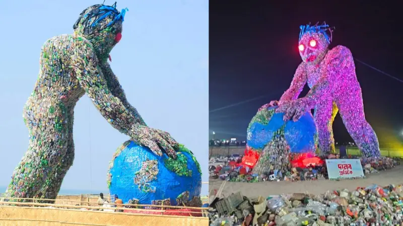 কক্সবাজারের নীল সমুদ্রের গর্জনের মাঝেই দাঁড়িয়ে আছে এক নীরব সতর্কবার্তা- প্লাস্টিকের দৈত্য। দূর থেকে মনে হয়, যেন কোন অদৃশ্য বিপর্যয়ের দূত বালিয়াড়ি পেরিয়ে উঠে এসেছে তটে। কাছে গেলে বোঝা যায়- এটা কেবল ভাস্কর্য নয়; মানুষের ফেলে যাওয়া প্লাস্টিকের পাহাড় কীভাবে আমাদের পৃথিবীকেই দানবে পরিণত করছে, তার প্রতিবিম্ব।